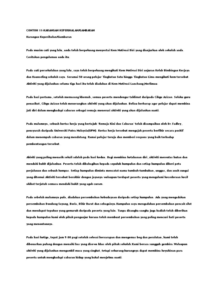 Karangan yang berbentuk gambaran atau keperihalan merupakan suatu bentuk penulisan yang memerihalkan atau menggambarkan apa. Berikut adalah 10 contoh format karangan Bahasa Melayu PT3. Karangan laporan lawatan ke melaka bandar.